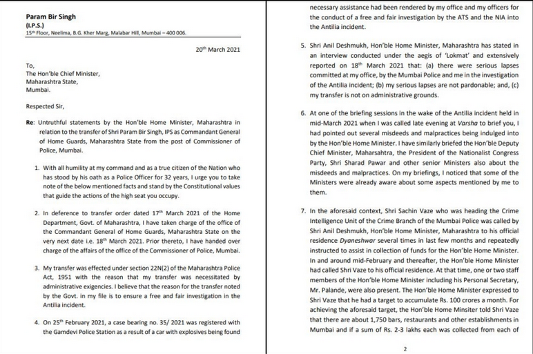 তিনি দাবি করেন মাসে ১০০ কোটি টাকার তোলাবাজি চলছে। হোটেল, রেস্তোরা থেকে শুরু করে একাধিক জায়গা থেকে এই তোলাবাজির কাজ চলত। পরমবীরের দাবি, ওই টাকা তোলার জন্য মুম্বইয়ের ১,৭৫০টি পানশালা, রেস্তোরাঁ অন্য ব্যবসায়িক প্রতিষ্ঠানকে নিশানা করা হয়েছিল। আর এই কাজে সামনের সারিতে রাখা হয়েছিল এনকাউন্টার স্পেশালিষ্ট শচিন ওয়াজকে। মহারাষ্ট্রের স্বরাষ্ট্রমন্ত্রীর এহেন তোলাবাজির অভিযোগ সামনে আসতেই তাঁর পদত্যাগের দাবিতে সরব হলেন বিজেপি নেতা দেবেন্দ্র ফরনবীশ। শিবসেনা সরকারকে বিঁধতে আসরে নেমেছে বিজেপি। এই পরিস্থিতিতে মুখ্যমন্ত্রী উদ্ধাব ঠাকরে চিঠির সত্যতা খতিয়ে দেখছেন। এমনকি এও জানা যাচ্ছে অনিল দেশমুখকে পদত্যাগ করার কথা বলতে পারে শিবসেনা।